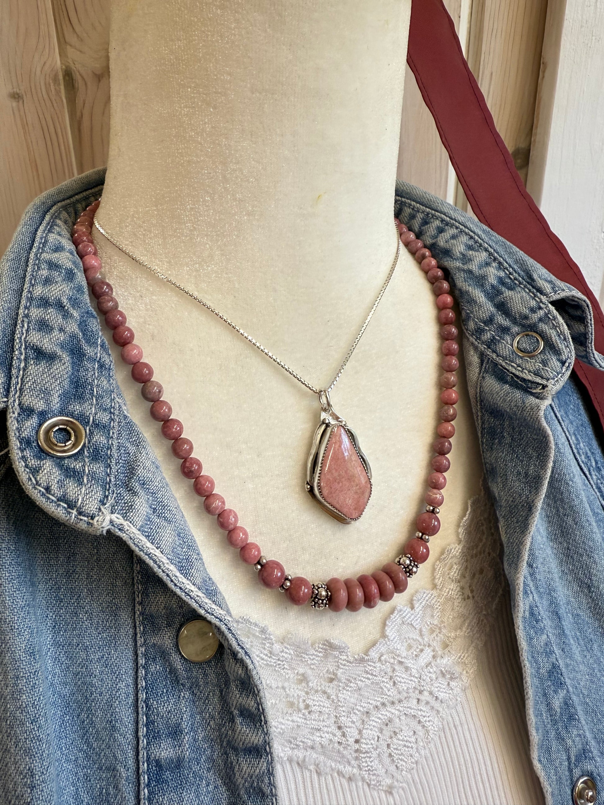 This is such a soft and earthy toned pink necklace. It goes well with all shades of beige, brown, and grey as well as black. It is 20” long and has a generous sterling lobster clasp.