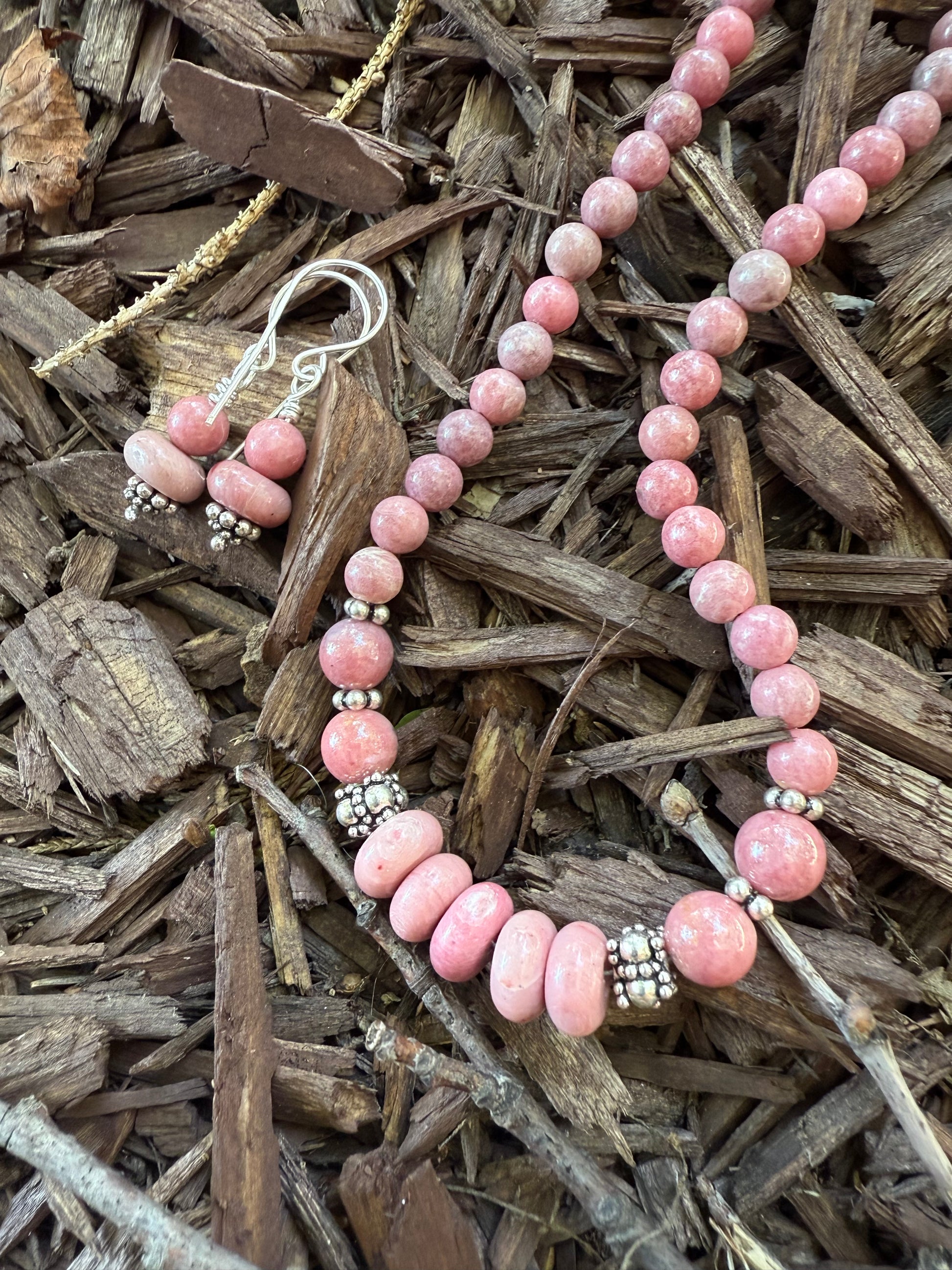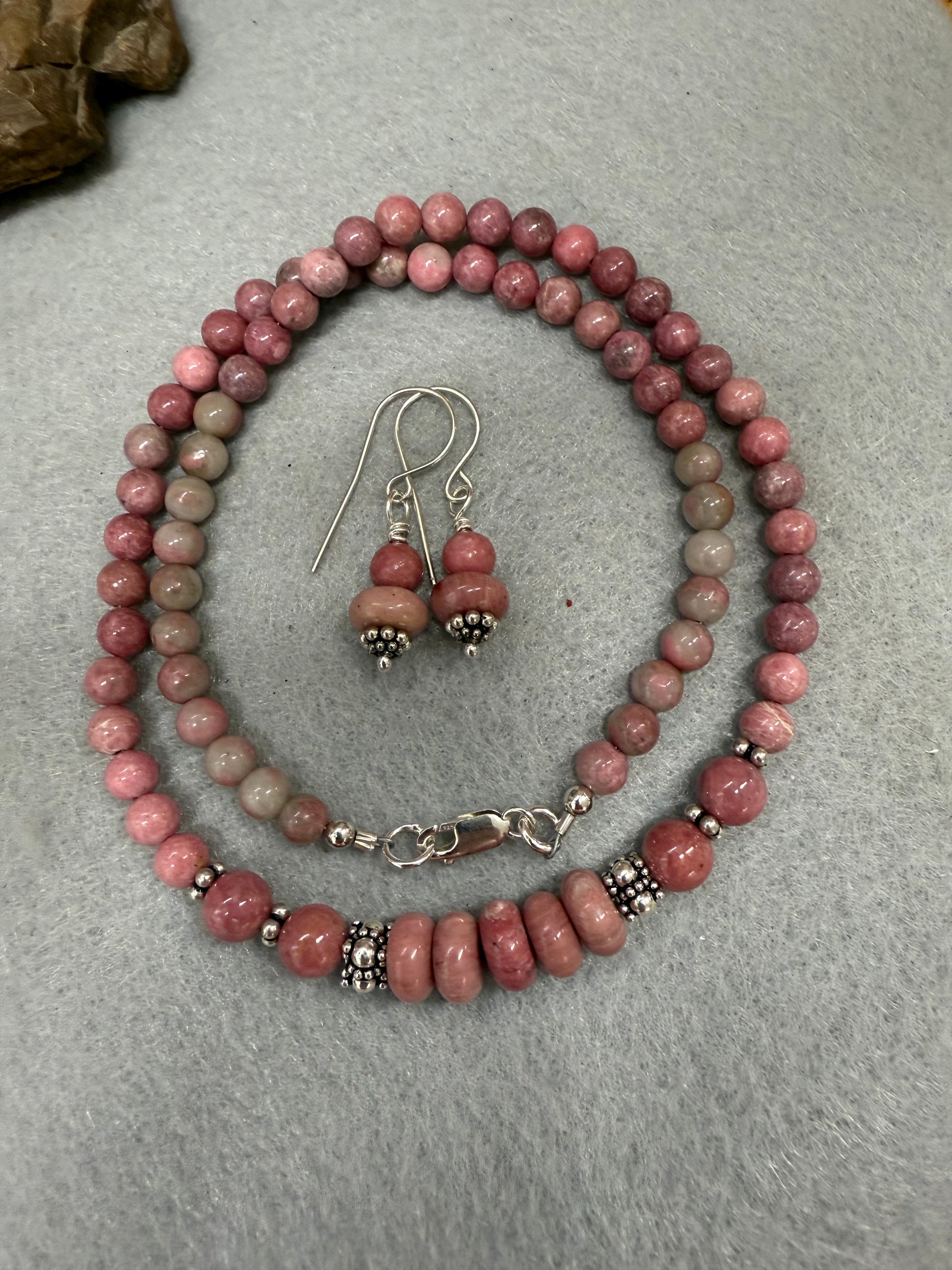 Handmade Sterling Silver Norwegian Thulite Beaded Necklace and Earrings