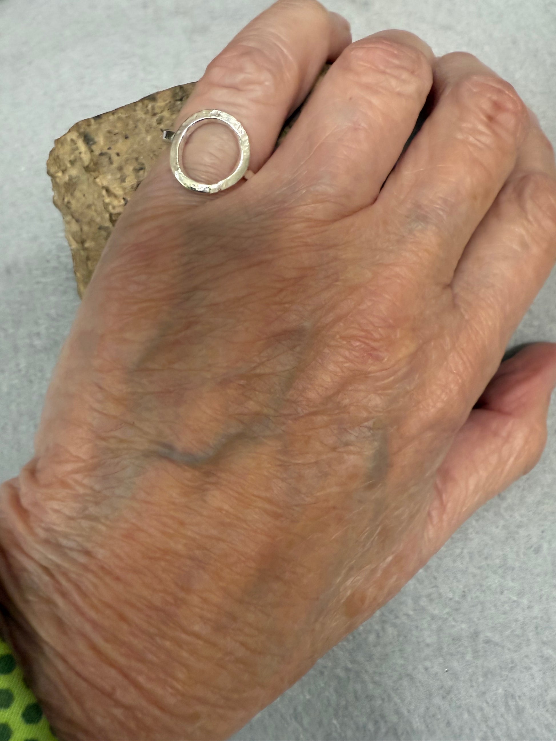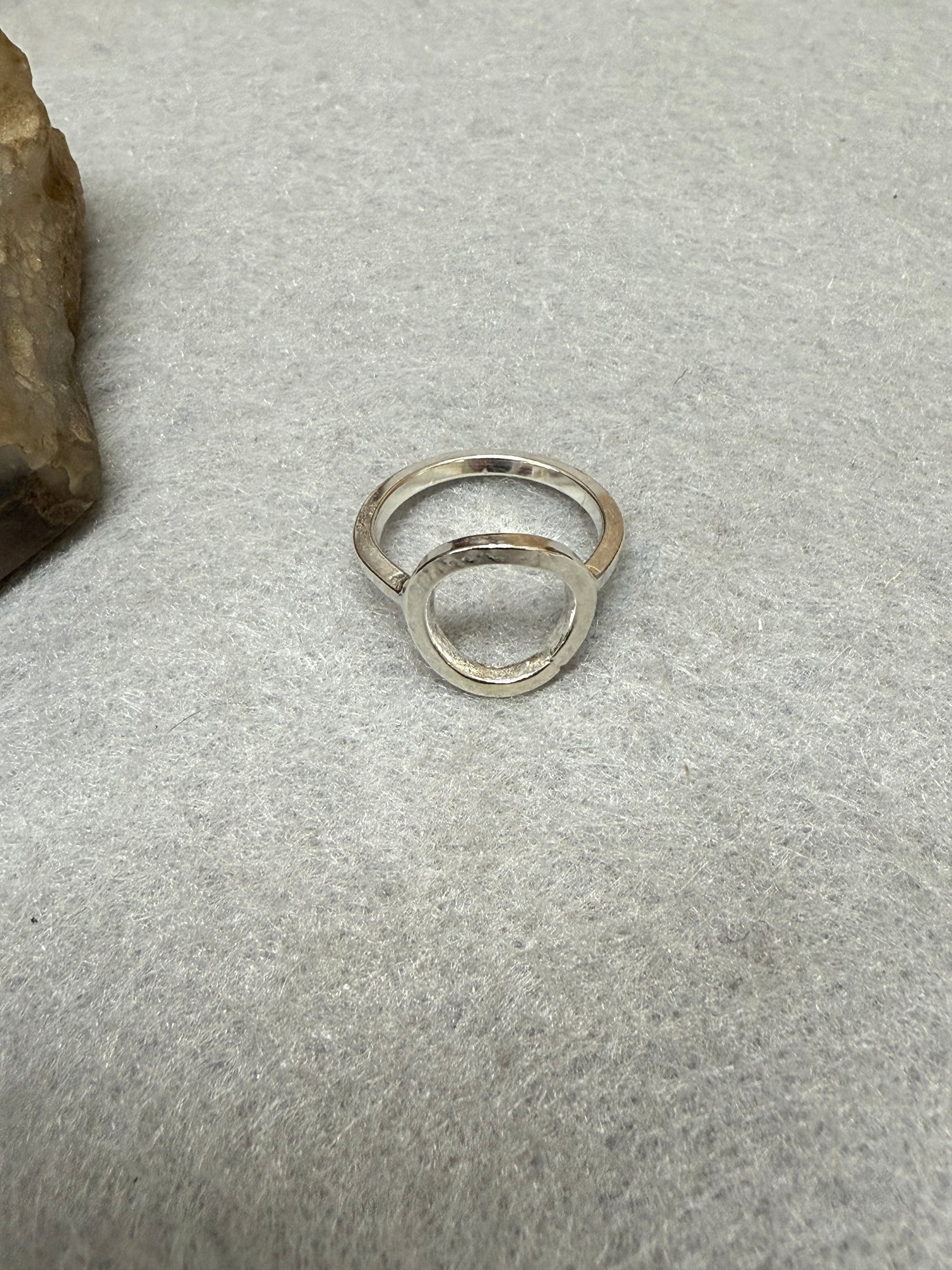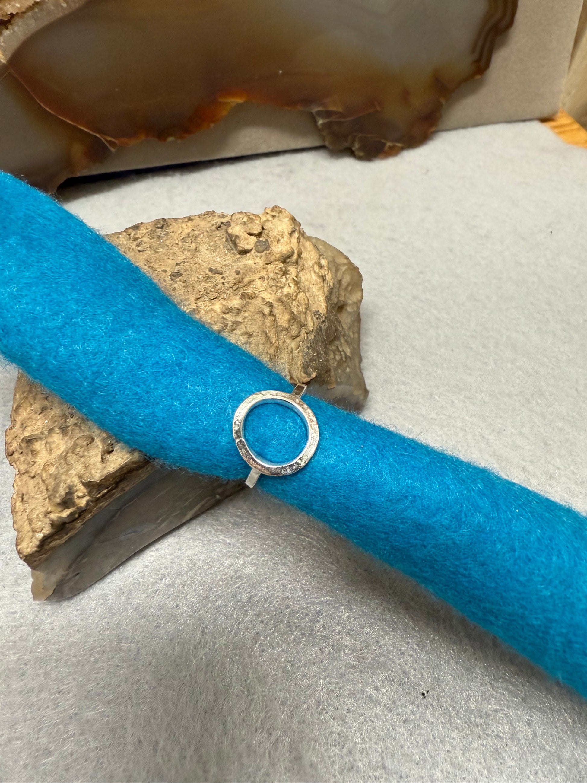 This is a little circle ring that’s adorable and comfortable as a pinkie ring. It is a size 4. It is made using square wire and it is slightly knicked up for a little texture. Super Shiny.